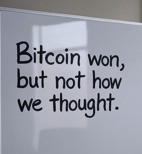 So summing up, Bitcoin is winning in a way that most bitcoiners did not foresee. Instead of lots of new people going to buy bitcoin either p2p or from typical KYC exchanges, we have a lot of people buying Bitcoin ETFs and Bitcoin Treasury Co’s or Treasury Co equity or debt. So it’s almost like an indirect form of buying bitcoin because many investors can’t or won’t buy bitcoin directly - but they would buy debt, preferred share instruments or equity in a treasury company that WILL then buy bitcoin.