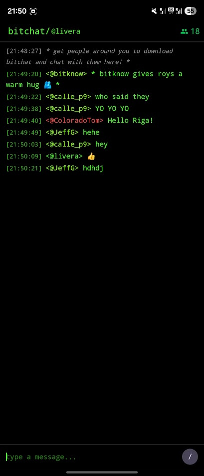 While we had a lot of bitcoiners all together, we did play around with Bitchat, a bluetooth mesh chat app. Jack Dorsey made the first version on iPhone and Calle followed up quickly with an android version. It was used over at the cypherpunk stage to take anon audience questions. Of course it’s early days, and there are open questions about whether such a system really will work at scale and how it would handle DOS/Spam etc. But basically its an app you join (android here), and then you can see who else is physically nearby in the chat in the top right (18 people in this example).