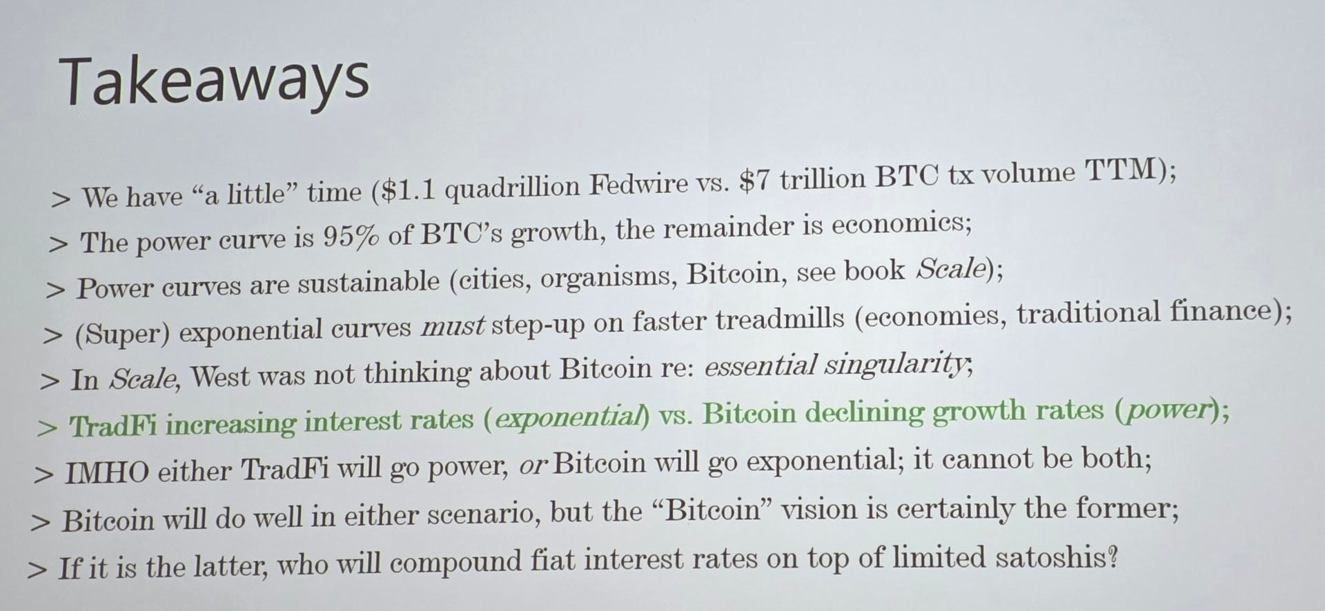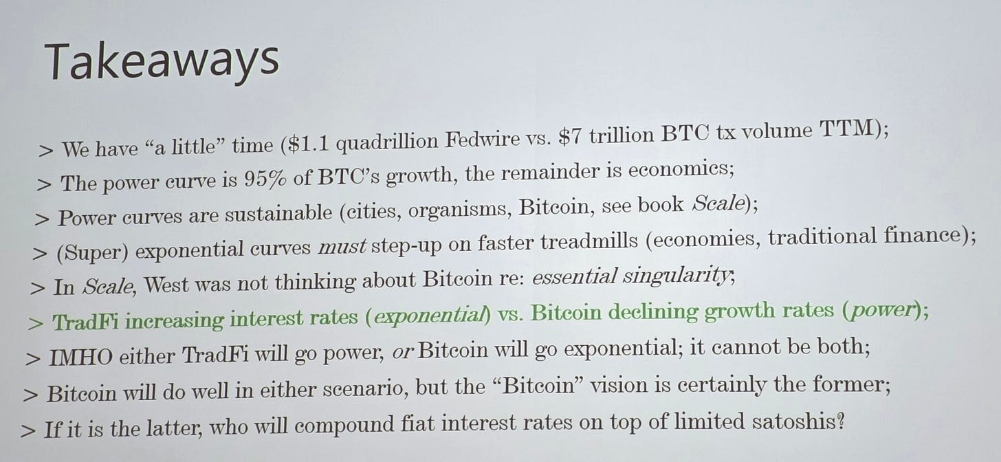 Is TradFi going to turn into a power law or will Bitcoin become an exponential? I believe we will eventually get onto a bitcoin standard with bitcoin denomination, which also implies that the TradFi system will have to change into a power based growth system. My reasoning being: the opposite implies that there would still be a lot of fiat cash or fiat bond bag holders, who are simply happy to willingly be debased. Why would they do that? Or perhaps they will be coerced? Who knows. It’s exciting to think about and envision what happens as Bitcoin grows.